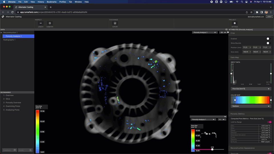 - Clicking on a given pore provides "Selected Pore Metrics" about that individual's size, shape, and location.